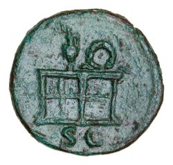 TRAJAN, (A.D. 98-117), AE semis, issued 107, Rome Mint, (2.58 g), obv. laureate draped head to right of Trajan, around IMP CAES NERVA TRAIAN AVG, rev. table with jug and wreath, S C in exergue, (S.3247, RIC 687, C.349). Green patina, nearly very fine and scarce.