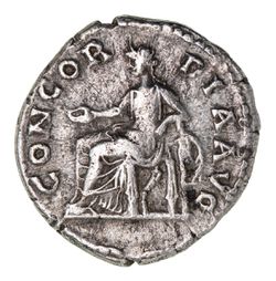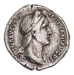 SABINA, wife of Hadrian, (A.D. 117-136/7), silver denarius, issued 129 A.D. (Hill), Rome Mint, (2.95 g), obv. diademed draped bust to right, of Sabina with hair in queue down back, SABINA AVGVSTA HADRIANI AVG P P around, rev. CONCORDIA AVG around, Concordia seated to left on throne, holding patera in right hand and resting on statuette of Spes, cornucopiae below seat, (S.3919, RIC 398, RSC 12). Toned, nearly very fine, scarce.