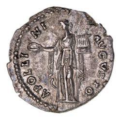 ANTONINUS PIUS, (A.D. 138-161), silver denarius, Rome Mint, issued 142, (3.46 g), obv. around ANTONINVS AVG PI VS P P TR P COS III, laureate head to right, rev. APOLLINI AVGVSTO, Apollo standing facing head to left holding patera and lyre, (S.4051, RIC 63A, RSC 59, BMC 186). Lightly toned, nearly extremely fine.