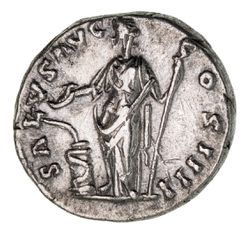 ANTONINUS PIUS, (A.D. 138-161), silver denarius, Rome Mint, issued 159-160, (3.22 g), obv. ANTONINVS AVG PIVS P P TR P XXIII, laureate head to right, rev. SALVS AVG COS IIII, Salus standing left feeding snake arising from altar and holding sceptre, (S.4106, RIC 304). Good very fine.