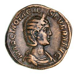 OTACILIA SEVERA, (wife of Philip I), (A.D. 244-249), AE sestertius, Rome Mint, issued 245-247, (20.39 g), obv. diademed draped bust with large head to right, around MARCIA OTACIL SEVERA AVG, rev. Concordia seated left holding patera and double cornucopiae, around CONCORDIA AVGG, SC in exergue, (S.9164, RIC 203a). Toned, very fine, scarce.