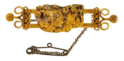 GOLD NUGGET BROOCH, in gold (18ct; 14.27g; 58x14mm), by JJR, features a decorative double bar with a large gold nugget with some quartz in the centre, pin-back with safety chain, with unofficial box. Very fine.