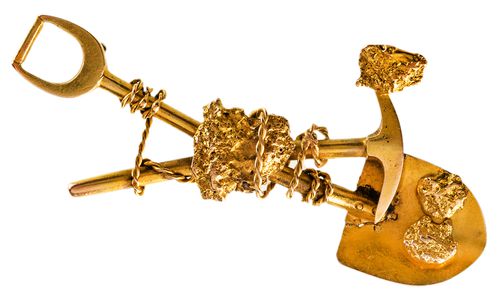 PICK SPADE AND GOLD NUGGETS BROOCH, in gold (18ct; 7.41g; 57x30mm), no maker, features a ...