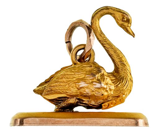 SWAN PENDANT/CHARM, in gold (9ct; 1.79; 19x17mm), maker unknown, features a swan on a plaque, with suspension ring on swan's back. Very fine.