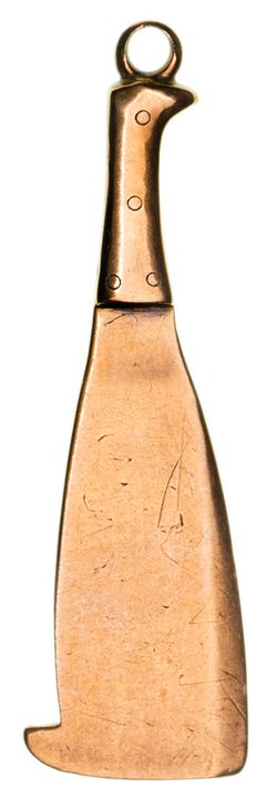 BUTCHER'S MEAT CLEAVER CHARM, in gold (9ct; 1.32g; 10x32mm), attributed to maker, Willis & Sons, with ring top suspension at end of handle. Fine.