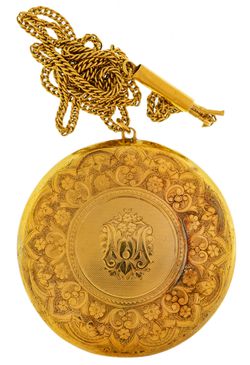 AUSTRALIA PENDANT, c1901, with chain, all in gold (both tested as 18ct; 14.19g; pendant 39.5mm; chain approx length 45cm), attributed to G.R.Addis, features a decorated circular case (non-opening) featuring the Australian coat-of-arms on one side with floral decoration on the other side, with ring top suspension to which a thin chain is attached, in a G.R.Addis fitted case. Extremely fine.