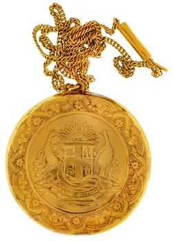 AUSTRALIA PENDANT, c1901, with chain, all in gold (both tested as 18ct; 14.19g; pendant 39.5mm; ...