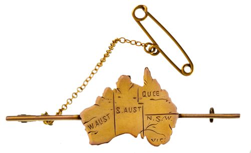 AUSTRALIA BROOCH, in gold (9ct; 3.10g; 50x17mm), attributed to maker, Willis & Sons, features a thin bar with a centerpiece of a map of Australia excluding Tasmania and Territories, impressed on the map are the abbreviations, "W.Aust, S.Aust, Quee, N.S.W. and Vic.", pin-back with safety chain. Very fine.