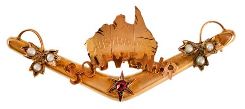 AUSTRALIA SOUVENIR BROOCH, in gold (9c; 3.08g; 52x22mm), attributed to maker, Willis & Sons, features a boomerang with flower curved over each end, each flower decorated with three seed pearls, at the base of the boomerang is a star with a small red gemstone centre and above this is a curved and voided word, "SOUVENIR", attached at the back of the boomerang is a map of mainland Australia, pin-back. Toned good very fine.