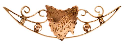 TASMANIA BROOCH, in gold (9ct; 2.42g; 45x13.5mm), by F.A (name of maker unknown), features a curved double bar decorated with balls and scrolls with a map of Tasmania in the centre, pin-back. Good very fine.