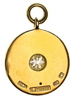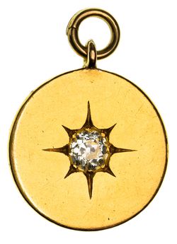 DIAMOND PENDANT, c1880, in gold (18ct; 16.50g; 25mm), by H.(enry) Steiner, features a plain gold circular pendant with an engraved star in the centre and this filled with a large claw set old cut diamond (c80 pts), ring top suspension, with an original H.Steiner box. Hairlines and a small edge dent, otherwise good very fine.
