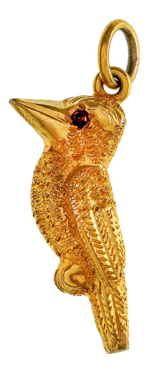 KOOKABURRA PENDANT/CHARM, in gold (9ct; 1.10g; 15x21mm), attributed to maker, Duggin, Shappere & Co, features a sitting kookaburra with small black stone eyes, with suspension loop on top of head. Good very fine.