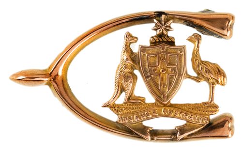 AUSTRALIA WISHBONE BROOCH, in gold (9ct; 2.53g; 35x21mm), attributed to maker, Willis & Sons, features a wishbone with the coat-of-arms of Australia inside, pin-back. Extremely fine.