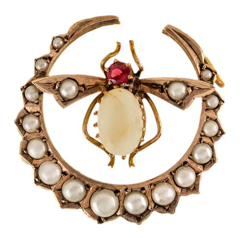 BEETLE BROOCH, in gold (9ct; 3.16g; 24.5mm), by Aronson & Co, features an almost complete circle decorated with imitation pearls and across the centre is a flying beetle with an oval opal body, a ruby-like gemstone head and wings set with imitation pearls, pin-back. The opal with a crack, otherwise very fine.