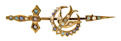 BIRD ON SWORD BROOCH, in gold (tested as 15ct; 5.68g; 78x23mm), by Harry Young, features a sword with a diving bird in a crescent in the centre, all items decorated with small opals, pin-back. Extremely fine.