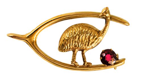 EMU BROOCH, c1910, in gold (15ct; 3.48g; 49x21mm), by A.L.B (August L. Brunkhorst), features a ...
