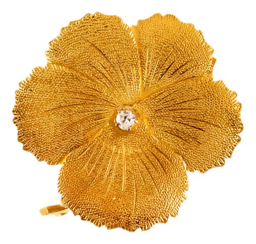 FLORAL BROOCH, in gold (tested as 15ct; 4.60g; 29mm), attributed to maker, Duggin, Shappere & Co, features a flower with a small claw set modern cut diamond in the centre. Nearly uncirculated.