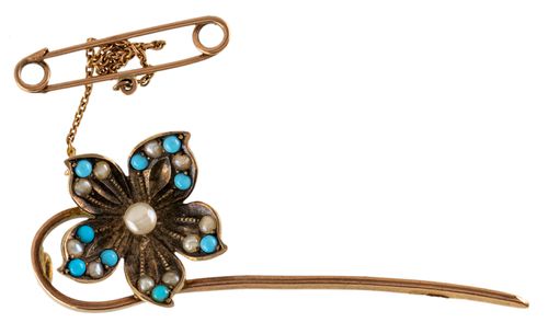 FLORAL BROOCH, in gold (9ct; 4.15; 49x18mm), attributed to maker, Duggin, Shappere & Co, features a curved thin bar with a flower at the end decorated with seed pearls (11) and natural turquoises (9), pin-back with safety chain. Nearly very fine.
