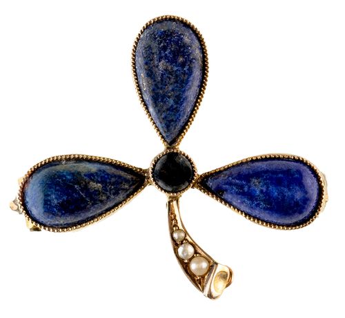 FLOWER BROOCH, in gold (tested as 18ct; 3.94g; 31x29mm), by (J.R.) Rowland, features a flower with three lapis lazuli leaves and a small centre of lapis lazuli, and the stem below is decorated with three natural seed pearls, pin-back with loop provision for safety chain. Extremely fine.