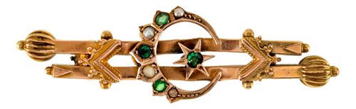 EMERALD AND PEARL BROOCH, in gold (9ct; 3.40g; 45x16mm), attributed to maker, Willis & Sons, features two decorated bars with an emerald and pearl decorated crescent in the centre surrounding a star with an emerald centrepiece, pin-back. A few dents on the bars, otherwise toned fine.