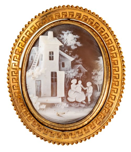 CAMEO BROOCH, c1906, with gold frame (tested as 15ct; tot wt 21.00g; 47x55.5mm), by J.M.W. (J.M.Wendt), features a cameo of family figures in a rural scene, in a gold frame that rotates and an outer decorated fixed frame, the reverse is possibly for inserting a photograph that can be rotated to the front, pin-back with loop provision for safety chain, with damaged J.M.Wendt box of issue featuring a woman on the lid wearing Victorian era clothing. Nearly uncirculated.