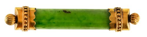 JADE BROOCH, with gold end pieces (15ct; tot wt 4.95g; 52x10mm), by DM & Co (D.Mackay & Co), features a jade bar with elaborate gold end pieces, pin-back, in other jeweller's case. Very fine.