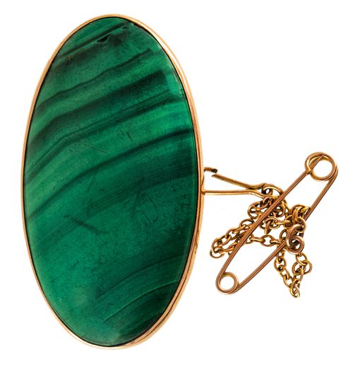 MALACHITE BROOCH, in gold frame (9ct; tot wt 9.20g; 33x13mm), by Dunklings, features an oval ...