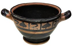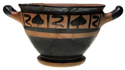 ANCIENT GREECE, Attica, (6th - 4th century BC), black on red ware skyphos, decorated with black bands and a repeating geometric design around the shoulders, handles in black, concentric black circles on base (10cm x 21 cm). Stress fractures on handles, a few minor areas of flaking, very fine and scarce.