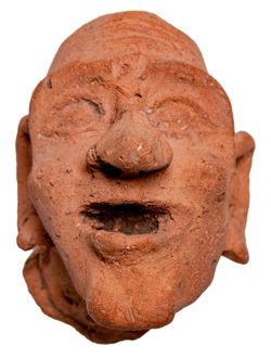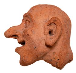 EGYPT, Alexandria, Hellenistic to Roman period, (3rd century BCE to 4th century AD), terracotta grotesque rendered in a reddish brown buff clay, the features exagerrated and displaying a developed interest in realism, heavy set brows frame oval eyes from which a rambunctious nose potrudes, the mouth set agape and leering, the bone structure of a skull is visible beneath the musculature of a bald head, the neck turns slightly to the right providing a sense of movement on which the folds of the skin are rendered above the suggestion of a neck hump (7cm tall). Very fine and scarce.