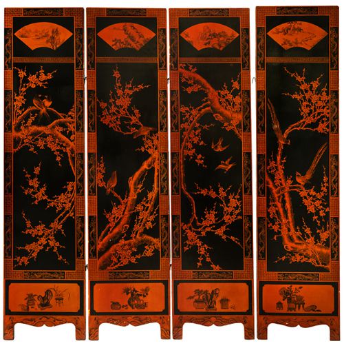 CHINA, early twentieth century, four panel screen, black lacquered timber, depicting birds in nature in red paint on one side, and bamboo in yellow paint on the other (each screen 169 cm x 41 cm). A few signs of wear and edge chips, one bottom pin missing, very fine.