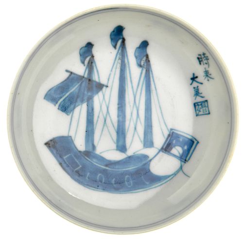CHINA, late Qing Dynasty, (19th century), blue and white export ware porcelain dish, ship motif in bowl, two lines around rim, simple alternating geometric pattern around body (11cm dia). Extremely fine.