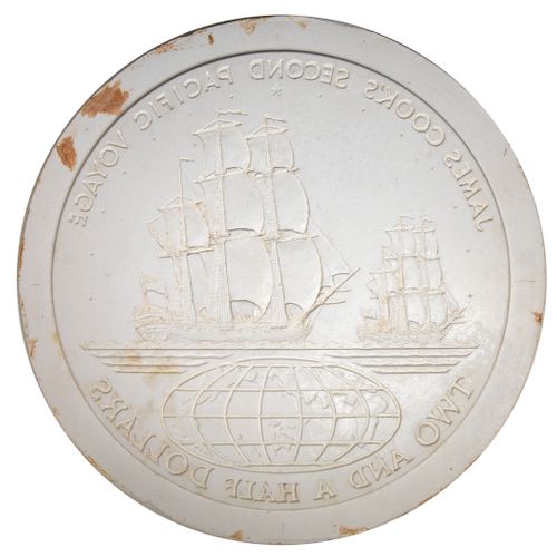 PLASTER CAST FOR THE PROPOSED DESIGN OF THE REVERSE FOR THE COOK ISLANDS 1973 TWO AND A HALF DOLLARS (KM.9), by James Berry. Glue adhesions on edge, very fine and rare.