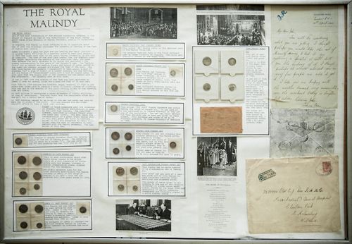 NUMISMATIC DISPLAY, the Royal Maundy, featuring maundy coins and related philatelic material, Charles II, twopence, 1672; maundy set, 1679, plus additional groat and threepence; maundy set, 1687, with additional twopence; silver penny, 1851; maundy set, 1900, plus additional silver penny; twopence 1902; maundy set, 1903, plus additional twopence; maundy set, 1937; maundy set, 1944. Fine - uncirculated.