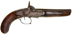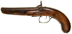 PERCUSSION PISTOL, smooth .45 calibre bore, mid-late 19th century, curved plain timber grip, some inscribed ...