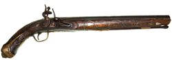 ANTIQUE REPLICA FLINTLOCK PISTOL, long barrel with some decoration at front end and back end ...