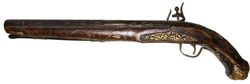 ANTIQUE REPLICA FLINTLOCK PISTOL, long barrel on timber base with pushrod attached, barrel decorated along total length and timber base and handle decorated with wire (some loose or missing), also some decorated brass sections, With some oxidation and other defects as mentioned, otherwise fine.