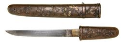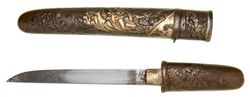 JAPAN, Edo-Meiji period, aikuchi tanto dagger, in brass sheath adorned with floral, bird, koi and religious motifs, (26.5 cm long). Very fine.