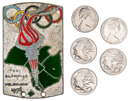 XVI OLYMPIAD, Melbourne 1956, enamelled car badge, by Stream Lux; Elizabeth II, twenty cents, 1969, 1970, 1971 (2), 1975. Very fine - extremely fine. (6)
