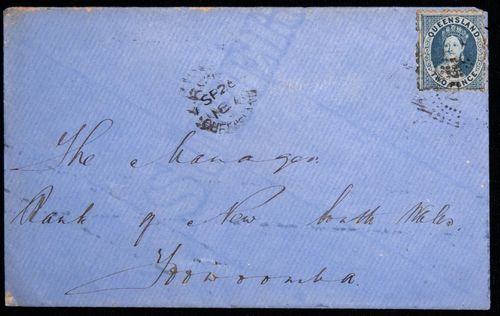 AUSTRALIA, cover of letter to the manager of the Bank of New South Wales in Toowoomba, postmarked with a blue Queensland Queen Victoria 2d stamp, cancelled 1888. Used, very fine.