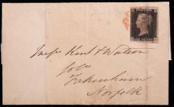 GREAT BRITAIN, one penny black, 1840, four margins on cover to Norfolk dated 22nd Oct 1840, red Maltese cross postmark (SG.1). Three vertical folds on cover, one affecting stamp, nearly very fine.