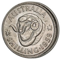 ELIZABETH II, shilling, 1959, struck off centre by 5 percent, raised lip rim partially, nearly full milled edge. Extremely fine.