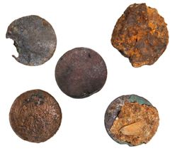 WRECK SALVAGE, Holloway pennies (1), Hanks & Lloyd (3), one unidentifiable, salvaged from the wreck of the Dunbar. Encrustations, salt water damage, poor, scarce. (5)