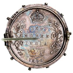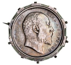 MONEYABILIA, assorted coin art pieces, a mix of silver and base metal, including ash trays (2), pill boxes, bracelets (2), notable 3 brooches comprising 1906 rupee, 1887 shilling, Canada 5 and 10 cents, Masonic pennies, French centime spy coin, an assorted accumulation. Fine - very fine. (lot)