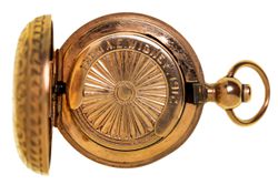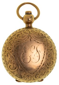 SOVEREIGN CASE, in 9 carat gold, floral hand engravings on front and back and shield area with "E S" initials, inside engraved "From A.E Wigney 1912". Very fine.