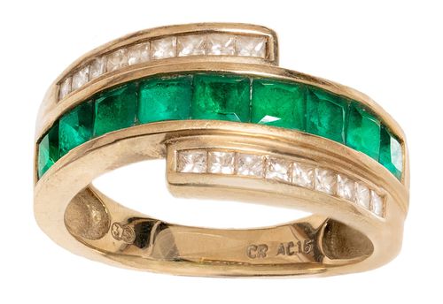 LADY'S DRESS RING, in 9 ct gold, nine square cut green stones with two rows of diamonds set in offset arms to either side, marked CR AC16 and 3 5 each in circles (3.46 g). Very fine.