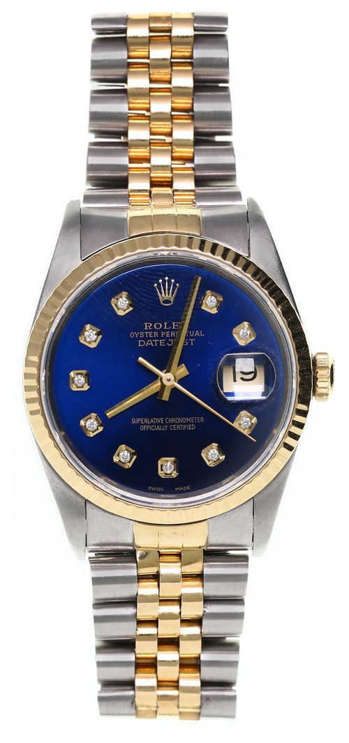 ROLEX OYSTER PERPETUAL DATEJUST, 36.00 millimetre stainless steel case, 18 carat yellow gold fluted bezel, model 16233, 1989 year of manufacture, (95.10 g), automatic movement, has an aftermarket genuine Rolex blue dial with diamond hour markers, date window at 3 o'clock, gold coloured stick hands, 18 carat and stainless steel jubilee band stamped REGISTERED SWISS MADE ROLEX T8 STEELINOX 62523H-18 with the Rolex crown logo, inside back case stamped MONTRES ROLEX SA GENEVA SWITZERLAND STAINLESS STEEL 16200, movement stamped in gold MONTRES ROLEX S.A. GENEVA SWISS THIRTY-ONE 31 JEWELS ADJ. 5 POSITIONS TEMPERATURE 3135 ROLEX. Watch in working order but not tested for accuracy, date function not confirmed.