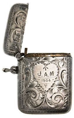 STERLING SILVER VESTA MATCH CASE, hallmarked for Chester, 1901, by Richmond Parker, ornately decorated and inscribed J.A.M 1904; spoon, handle made from deer tooth, with silver fittings and a bowl made from a 1950 East Africa shilling, marked 'Made in Kenya' and silver on handle; shilling pendant, Edward VII 1910 Australian shilling cut out of coat of arms, obverse engraved with details, GL in shield; nickel sovereign holder by ALD Dennison. Fine - very fine. (4)