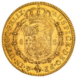 MEXICO, Charles III, gold eight escudos, 1780 FF, Mexico City Mint (KM.156.2). Mirror-like fields, unmarked surfaces, and an outstanding example, uncirculated and rare as such, one of the finest known.