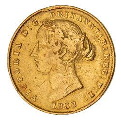 QUEEN VICTORIA, second type, 1858. Scratch on cheek, severe filing at top of obverse rim, ...