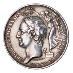 ADMIRAL OF THE FLEET LORD ANSON, Defeat of the French Fleet off Cape Finisterre, 1747, in silver (43mm) by T.Pingo, obverse, bust of Lord Anson, left, being crowned by Victory, reverse, Victory, holding a wreath and trident standing upon a sea monster, six laurel wreaths around with the names of the principal officers of the 'Centurion' on her world voyage of 1740-1744 (MH 345, Eimer 616). Nearly extremely fine and rare.